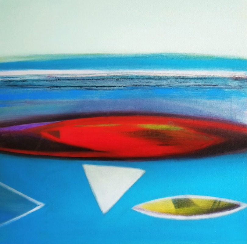 An abstract image that emphasizes color or texture in a simple way can become the focal point of a living room,